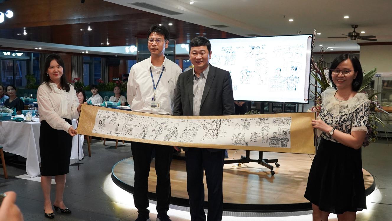 现场播放纪念视频,回顾陈致教授在UIC的点滴。中国语言文化中心助理教授杨志翔博士向陈致教授赠送纪念卷轴,在场的嘉宾和同事纷纷向陈致教授送上美好的祝福。陈致教授也为在场一百多位同事精心准备了纪念品,根据每位同事的姓名和特点,在每个马克杯印上独特的赠言。