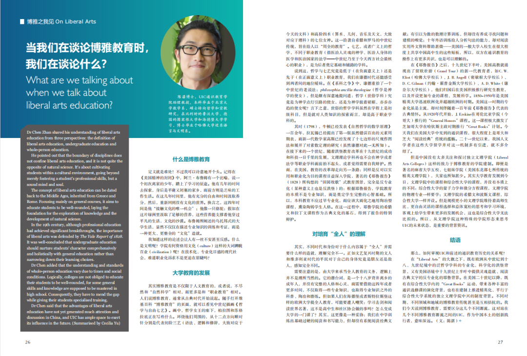 UIC 倡导博雅教育理念,在实践和探索中发展独具特色的博雅教育,这也是许多年轻学子对UIC心生向往的原因。什么是博雅教育,它的魅力何在?它是如何回应这个时代需求的?UIC通识教育学院助理教授陈湛博士在《当我们在谈论博雅教育时,我们在谈论什么?》一文中分享了自己的观点和看法。