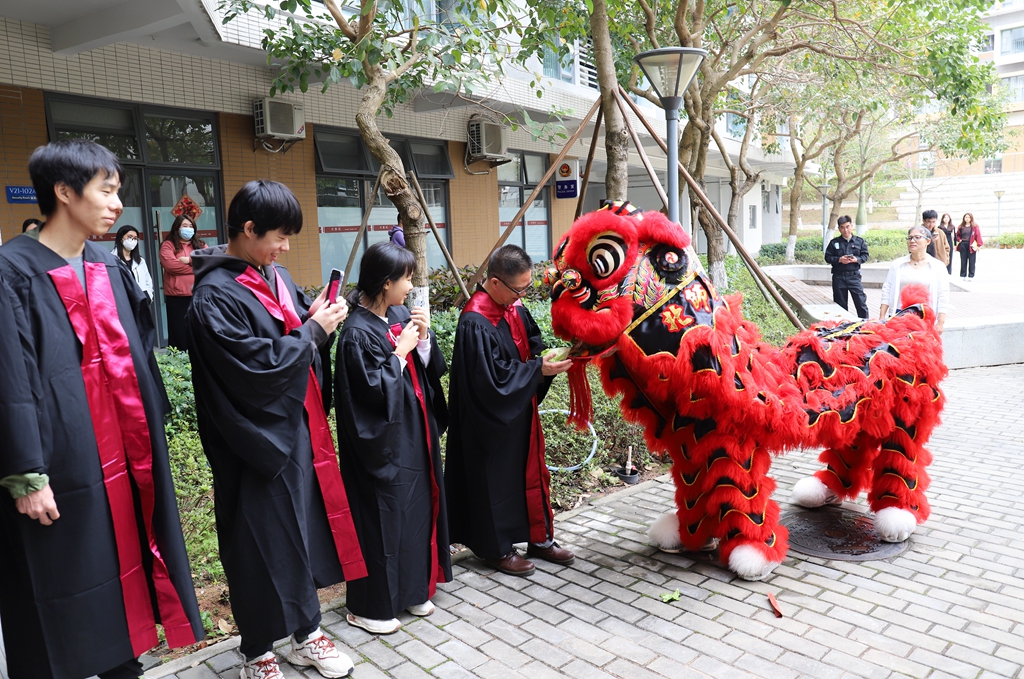 2023年2月6日中午,校园锣鼓喧天。各苑舍的舍监和苑舍学生委员会成员在苑舍门口迎接醒狮“采青”。利是(红包)与生菜悬挂于苑舍门梁,醒狮高高跃起采下“福气”,为师生送祝福。