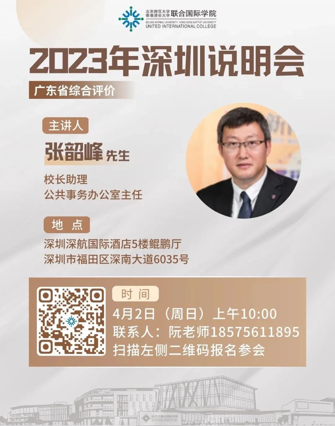 为帮助考生和家长更好地了解学校招生政策,3月25至26日,UIC在广东省多地市举办招生说明会,与考生、家长面对面交流,深度解读UIC的教育模式。3月26日,中国科学院院士、欧洲科学院院士、UIC校长汤涛教授出席深圳招生说明会,为家长及考生介绍学校概况、教育理念、办学特色等。