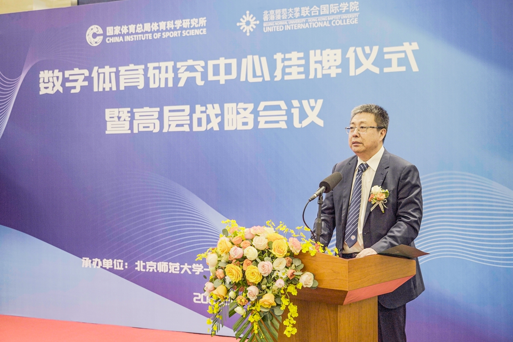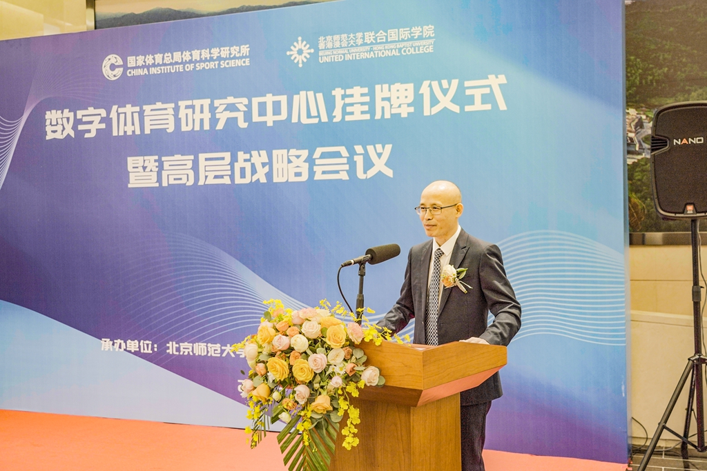 国家体育总局体科所所长曹景伟教授,总局科教司原司长蒋志学,中国科学院香山科学会议办公室主任田永生,总局体科所智慧体育创新研究中心主任李祥臣教授,UIC校长汤涛院士,副校长(研究和拓展)、研究生院院长贾维嘉教授,协理副校长(国际发展)、理工科技学院院长潘建新教授,工商管理学院院长刘文斌教授,通识教育学院全人教育中心主任石磊教授出席了数字体育研究中心揭牌仪式。李祥臣教授和石磊教授获聘为该中心联席主任。