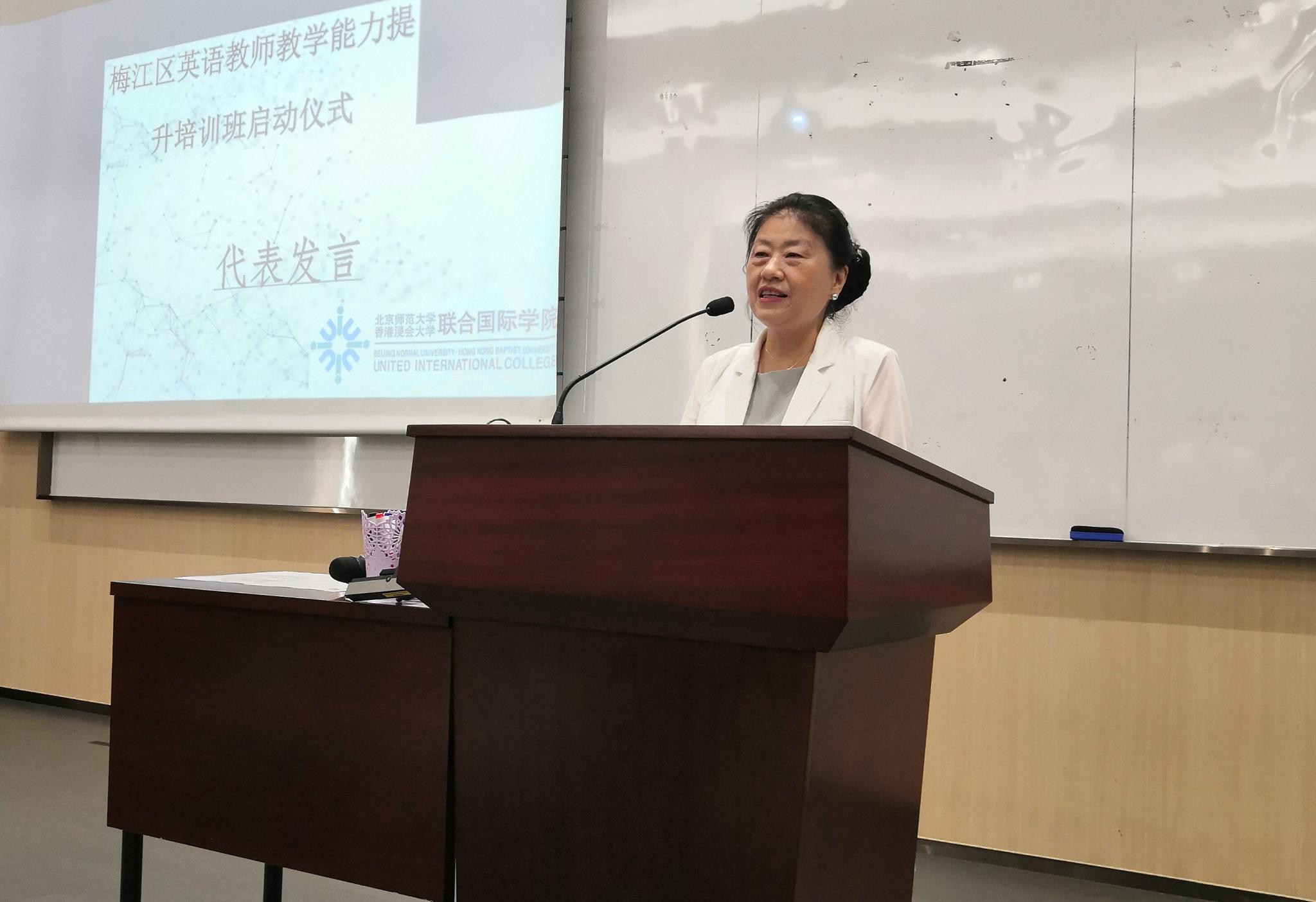 UIC校党委专职副书记王红、通识教育学院副院长郭海鹏、梅江区教育局代表陈燕婷,以及培训班任课老师等出席开班仪式。王红向参训老师介绍了UIC的发展历史和博雅教育特色,回顾了UIC和梅江区的相关合作,期待双方的结对帮扶能助力梅江区基础教育的发展。