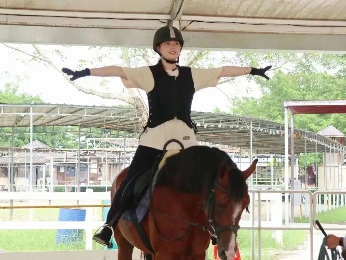 这个暑期,通过马术体验课,我不仅学会了骑马,获得了马术初级证书,还学会了与马匹交流,感受它的喜怒哀乐。课堂上,我们主要学习“盛装舞步”,还体验过清理马房、修理马蹄、喂马、刷马等与马匹相处的环节。(黄子涵 2020级会计学)
