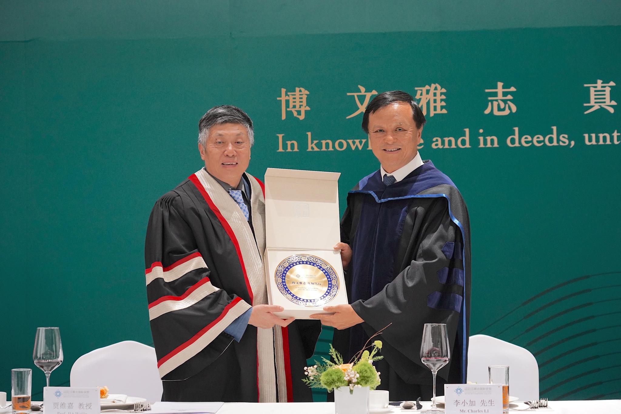 UIC副校长(研究和拓展)贾维嘉教授(右)向李小加先生(左)致送纪念品