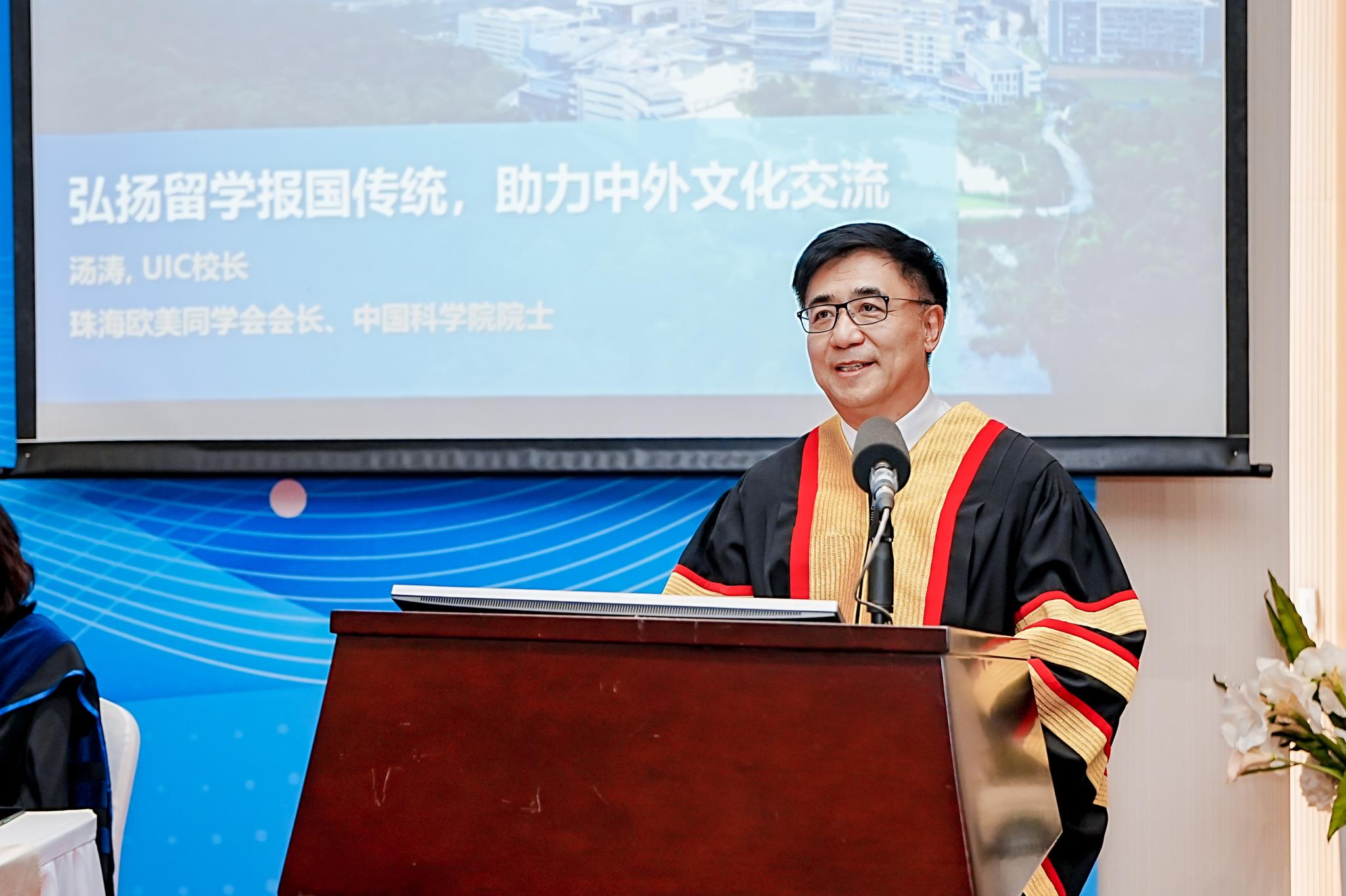 中国科学院院士、北师港浸大校长、珠海市欧美同学会会长汤涛以“弘扬留学报国传统,助力中外文化交流”为题发表演讲,分享留学报国传统的历史和留学人员的使命与责任,并介绍了北师港浸大对融汇中西的探索。作为国内首家国际化博雅大学,北师港浸大致力于探索具有中国特色的创新博雅教育,学校师资100%具有境外高校留学或工作经历,毕业生超过80%出国/出境深造,引进西学,弘扬国学,走出了中国教育国际化和中西文化融合的一条新路。他激励广大留学人员要弘扬留学报国传统,充分发挥自身优势,助力文化交流,把自己的梦想融入实现中国梦的奋斗之中。