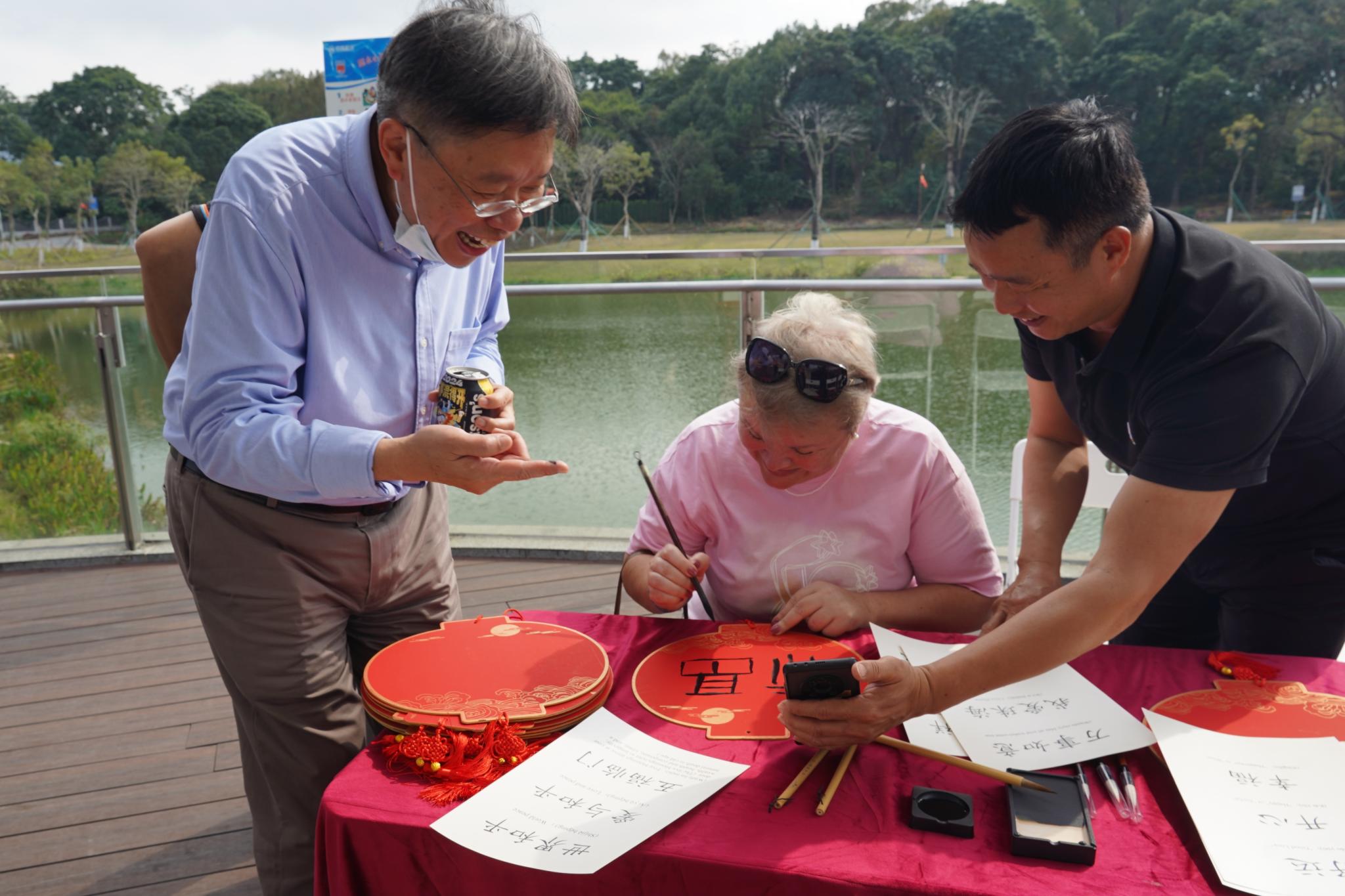 现场,北师港浸大同学带来精彩的舞龙舞狮表演,还有包汤圆、猜灯谜、画灯笼写祝福等传统民俗活动。