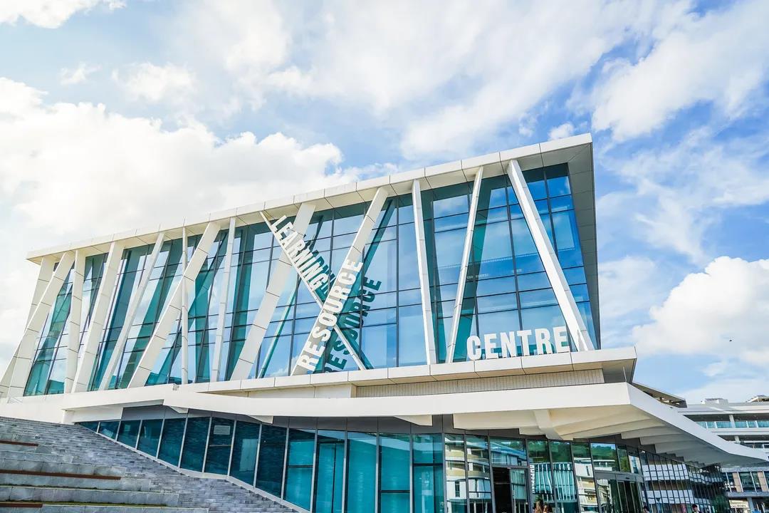 玻璃外观的学习资源中心在阳光下熠熠生辉,螺旋式的楼梯,草绿色地毯不断延伸,配置智能书架、图书自动分拣机、图书杀菌机、电子阅读机等高科技设施……