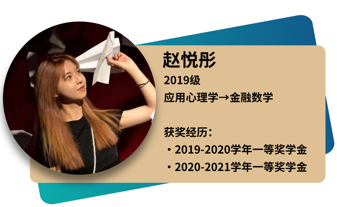 向往新专业的行业前景大二时,赵悦彤从应用心理学专业转到金融数学专业,转专业主要有两个原因,一是因为数学一直是赵悦彤的优势科目,她希望继续发挥优势;二是她与家人都认为金融学与数学交叉的前沿学科前景非常好。