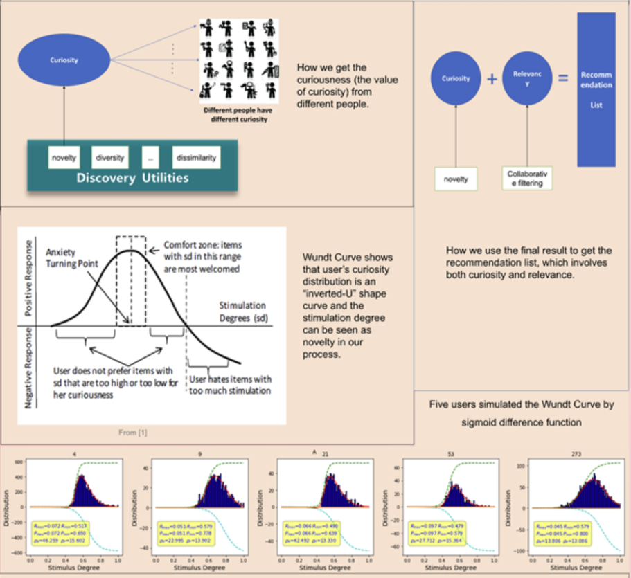 推荐系统在商务上有着广泛的应用,传统的推荐系统主要是基于分析用户的历史行为偏好,往往推荐的内容会产生高度的相似性。2016级金融数学的王泽华研究设计了一个基于好奇心的推荐系统(CBRS),利用心理学中著名的冯特曲线(Wundt Curve),用新奇来反向量化好奇心,根据用户的好奇心和相关性向用户做个性化推荐。在提高推荐新颖物品比率的同时,确保其准确性,从而提升用户在网站或App中的留存率和点击率,并实现更为精准的广告推送等服务。