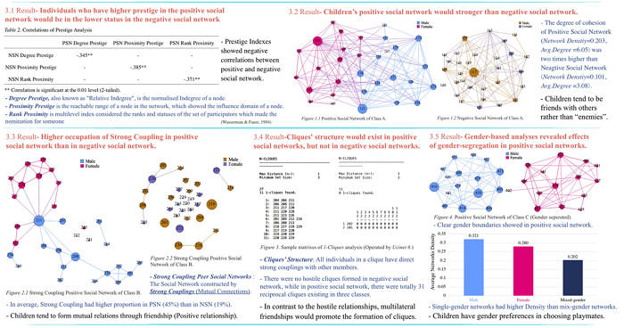 来自应用心理学专业大四的梁昊海研究的课题《学前幼儿的积极与消极同伴关系:社会网络分析》同时获得了“学部最佳海报奖”和“专业最佳海报奖”。该课题在运用社会网络分析探索学前幼儿积极与消极同伴关系的特点与联系。梁昊海在导师郭奕龙博士的指导下,通过同伴提名法,与93名学前幼儿一对一交流,收集到数据后通过Gephi和UCINET等数据处理软件对幼儿同伴关系进行多层次的可视化和量化分析。