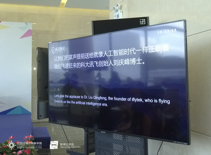 在颁授典礼之前,UIC举行了荣誉院士媒体见面会,来自中央、广东省、香港、澳门及珠海本地的十余家媒体出席。在见面会上,刘庆峰博士带来了“讯飞听见智能会议系统”,将见面会全程的中文语音即时转化为中英两种文字,成为见面会的一大亮点,也让现场观众感受到先进的语音识别及人工智能技术。