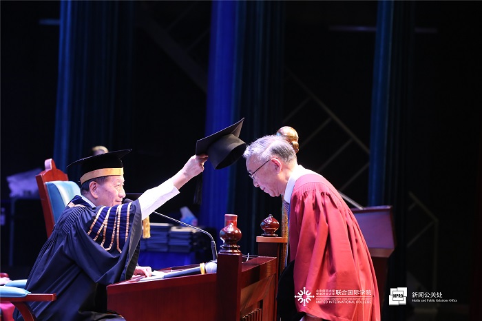 在毕业典礼上,UIC颁授荣誉院士荣衔予五位杰出人士,以表彰他们对国家、社会和教育事业的贡献,以及对UIC的支持。今年获嘉许的分别是美国心理学家、统计学家、加利福尼亚大学洛杉矶分校特聘教授Peter M. Bentler,科大讯飞创始人、现任公司董事长刘庆峰博士,香港科技大学创校校长吴家玮教授,北京大学哲学社会科学资深教授、北京大学博雅讲席教授叶朗,著名琵琶演奏家、中央音乐学院章红艳教授。