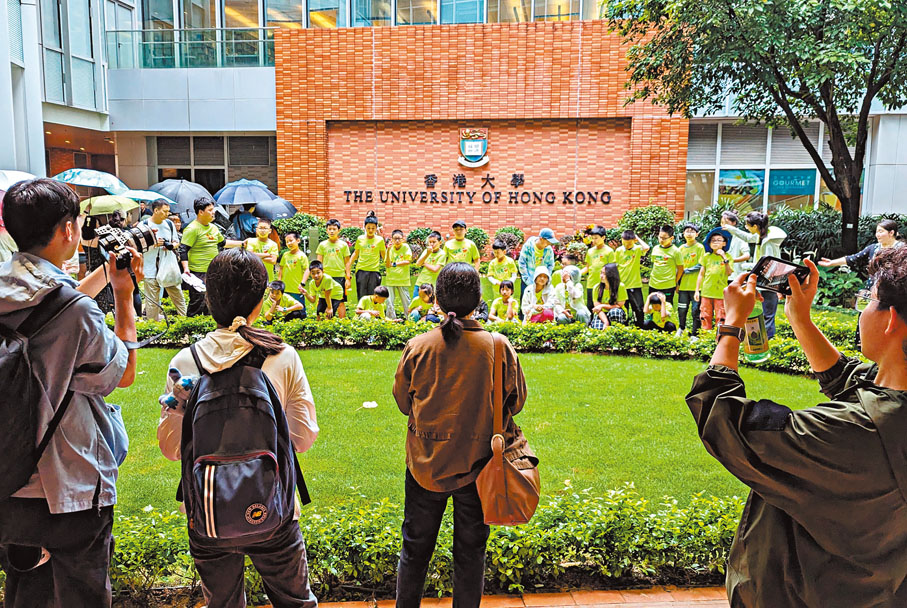 ●香港的大學逐漸成為內地學生高考之外的新賽道。圖為遊學團在港大校園內打卡。資料圖片