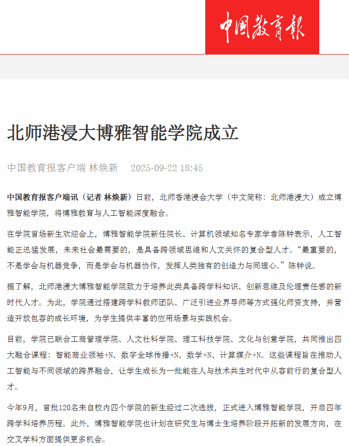 中国教育报客户端讯(记者 林焕新)日前,北师香港浸会大学(中文简称:北师港浸大)成立博雅智能学院,将博雅教育与人工智能深度融合。
