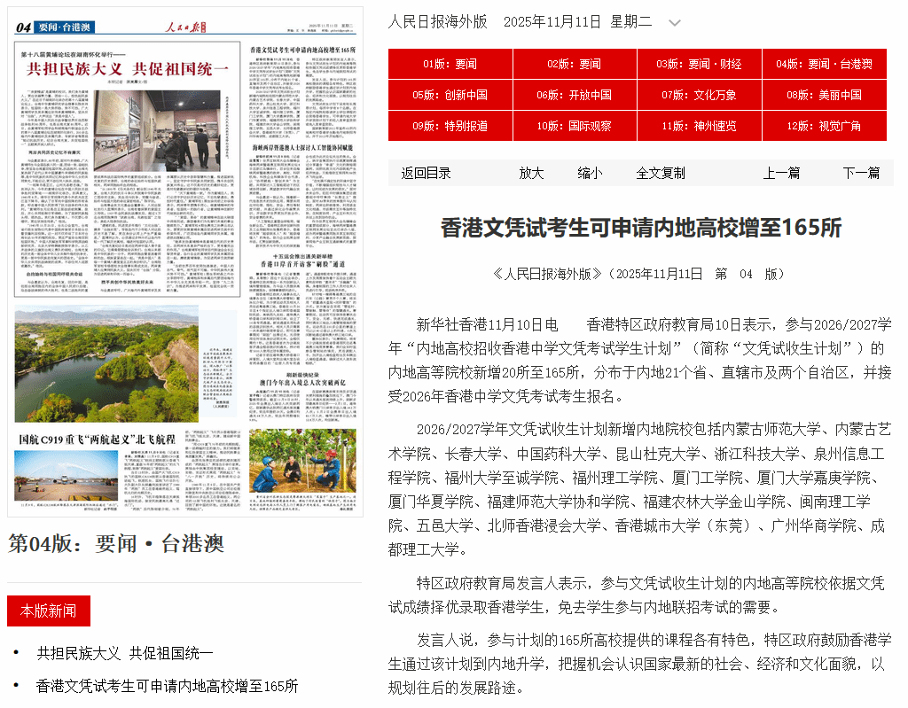 2025.11.11[人民日报海外版]--香港文凭试考生可申请内地高校增至165所