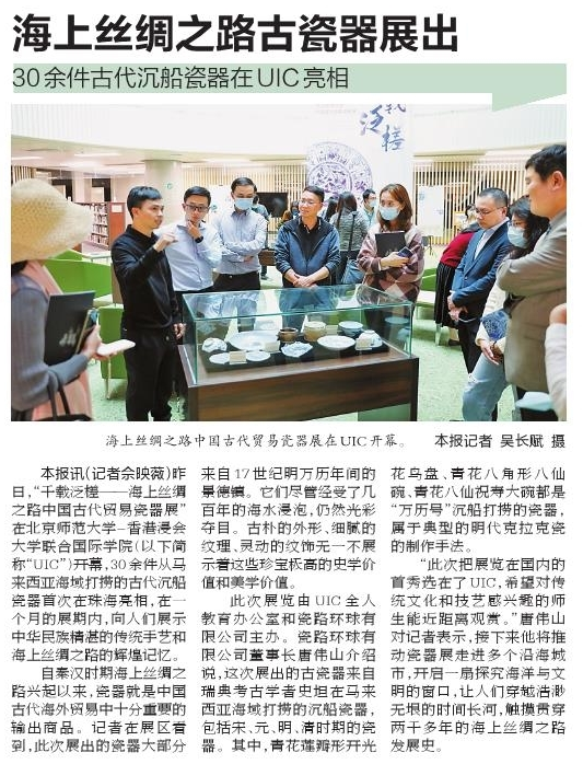 本报讯(记者佘映薇)昨日,“千载泛槎——海上丝绸之路中国古代贸易瓷器展”在北京师范大学-香港浸会大学联合国际学院(以下简称“UIC”)开幕,30余件从马来西亚海域打捞的古代沉船瓷器首次在珠海亮相,在一个月的展期内,向人们展示中华民族精湛的传统手艺和海上丝绸之路的辉煌记忆。