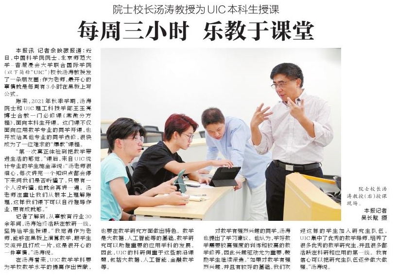 本报讯记者佘映薇报道:近日,中国科学院院士、北京师范大学-香港浸会大学联合国际学院(以下简称“UIC”)校长汤涛教授发了一条朋友圈:作为老师,最开心的事情就是每周有3小时在黑板上写公式。