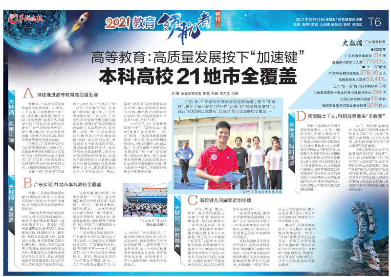 从总体来看,广东高等教育今年正处于持续建设、全面发展的时期。全省21地市高校全覆盖、新一轮“冲补强”公布、《广东省教育发展“十四五”规划》的正式发布……广东高等教育迎来一个新的春天。
