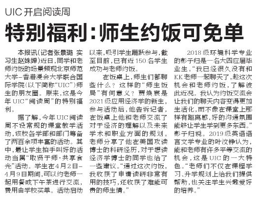 本报讯(记者张景璐 实习生赵姝婵)近日,同学和老师约饭的场景频现北京师范大学-香港浸会大学联合国际学院(以下简称“UIC”)师生的朋友圈。原来,这是今年UIC“阅读周”的特别福利。