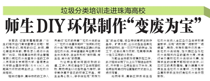 本报讯 记者宋雪梅报道:“女生们每天出门肯定都要化妆吧?那么考考你们,用完的口红、粉底、睫毛刷在丢弃前,要先怎么进行分类呢?”近日, 珠海高华市政综合管理有限公司垃圾分类宣传小组的工作人员来到北京师范大学-香港浸会大学联合国际学院(简称UIC),近距离为该校的师生送上一场垃圾分类培训。