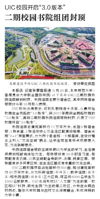 本报讯 记者张景璐报道:5月20日,北京师范大学-香港浸会大学联合国际学院(以下简称UIC)二期校园书院组团顺利封顶。书院组团主要为宿舍区,其中两栋宿舍楼预计今年10月投入使用。