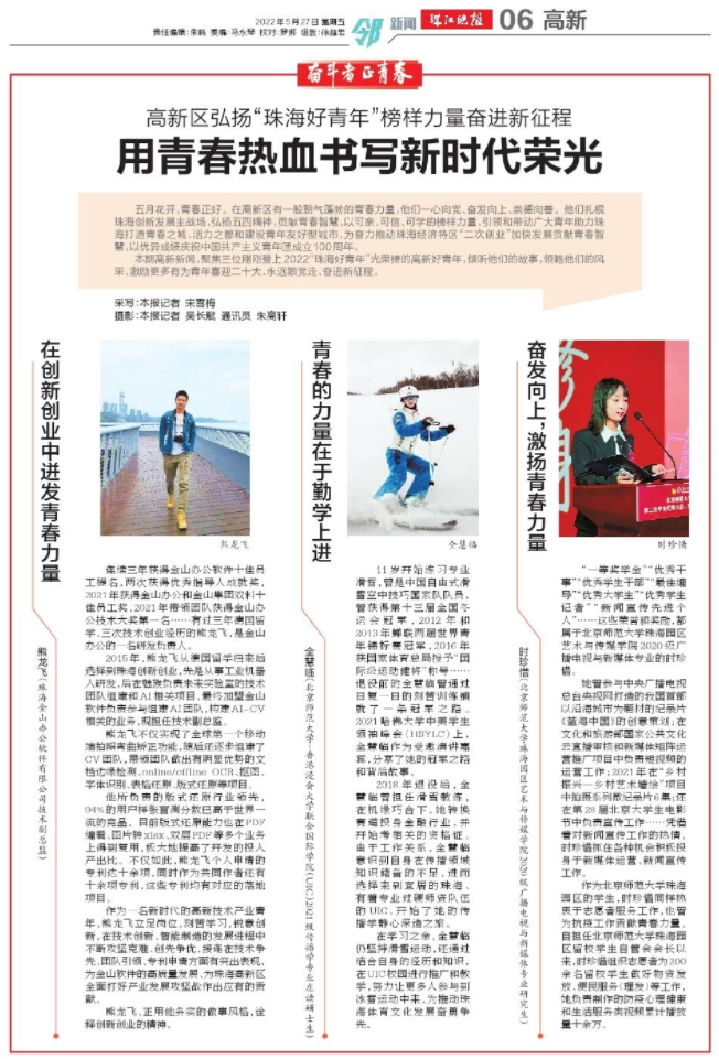 本期高新新闻,聚焦三位刚刚登上2022“珠海好青年”光荣榜的高新好青年,倾听他们的故事,领略他们的风采,激励更多有为青年喜迎二十大、永远跟党走、奋进新征程。