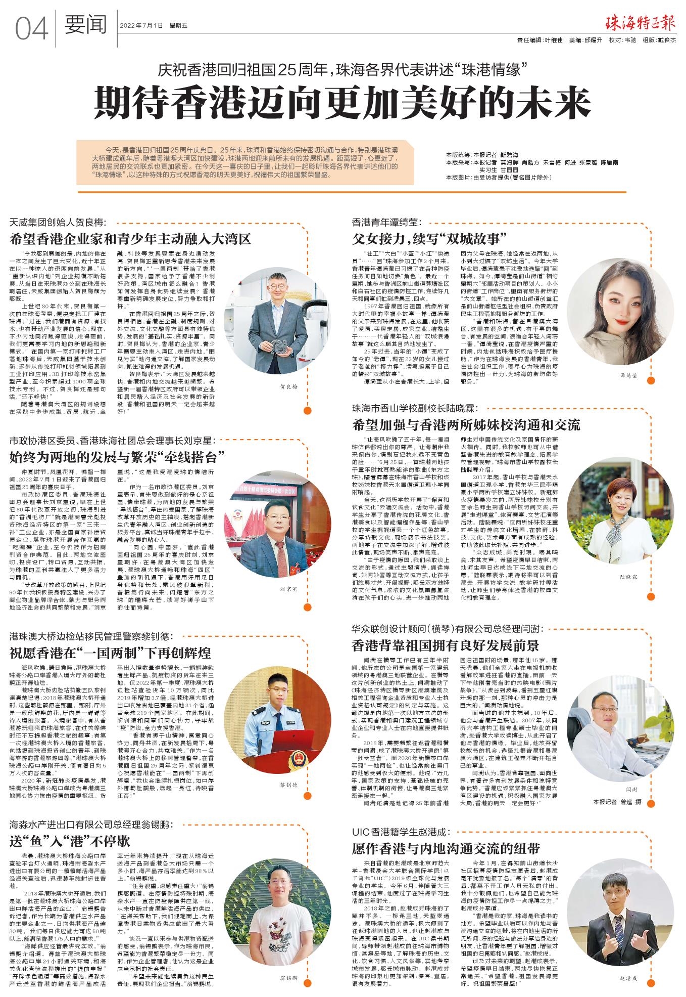 今天,是香港回归祖国25周年庆典日。25年来,珠海和香港始终保持密切沟通与合作,特别是港珠澳大桥建成通车后,随着粤港澳大湾区加快建设,珠港两地迎来前所未有的发展机遇。距离短了,心更近了,两地居民的交流联系也更加紧密。在今天这一喜庆的日子里,让我们一起聆听珠海各界代表讲述他们的“珠港情缘”,以这种特殊的方式祝愿香港的明天更美好,祝福伟大的祖国繁荣昌盛。