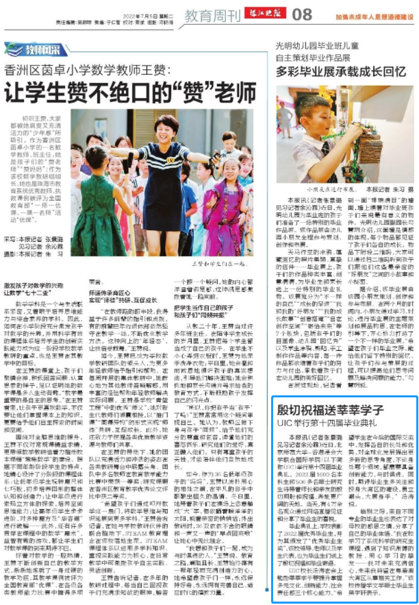 本报讯(记者张景璐 见习记者余沁霖)近日,北京师范大学-香港浸会大学联合国际学院(以下简称UIC)举行第十四届毕业典礼。2022届1600名本科生和500多名硕士研究生将带着师长和亲友的殷切期盼和祝福,奔赴更广阔的天地。当天,有4万余名观众通过网络直播见证和分享了毕业生的喜悦。