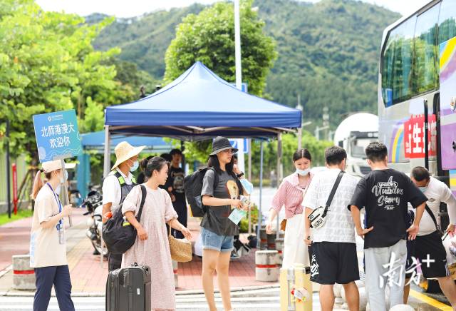今年共有110多位学长学姐作为迎新志愿者,为新生报到入宿、搬运行李等方面提供指引与帮助。为减少交通拥堵,学校还安排了接驳车辆在城轨唐家湾站迎接新生,并在校内设置接驳专车往返于校门口与宿舍区,协助新生搬运行李。