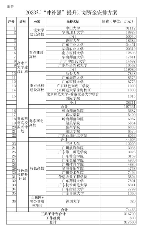 其中,一流大学建设高校中山大学、华南理工大学分别拟拨付3.1112亿元、1.8928亿元;重点建设高校共拟拨款11.9080亿元,包括暨南大学、广东工业大学、华南农业大学、南方医科大学、华南师范大学、广州中医药大学、广东外语外贸大学7所高校,每校拟拨款均超亿元,广工、华农超2亿元;重点学科建设高校则拟拨款2.8211亿元,分配给汕头大学、广东海洋大学、广东医科大学、广东以色列理工学院、北京师范大学珠海校区、北京师范大学-香港浸会大学联合国际学院。