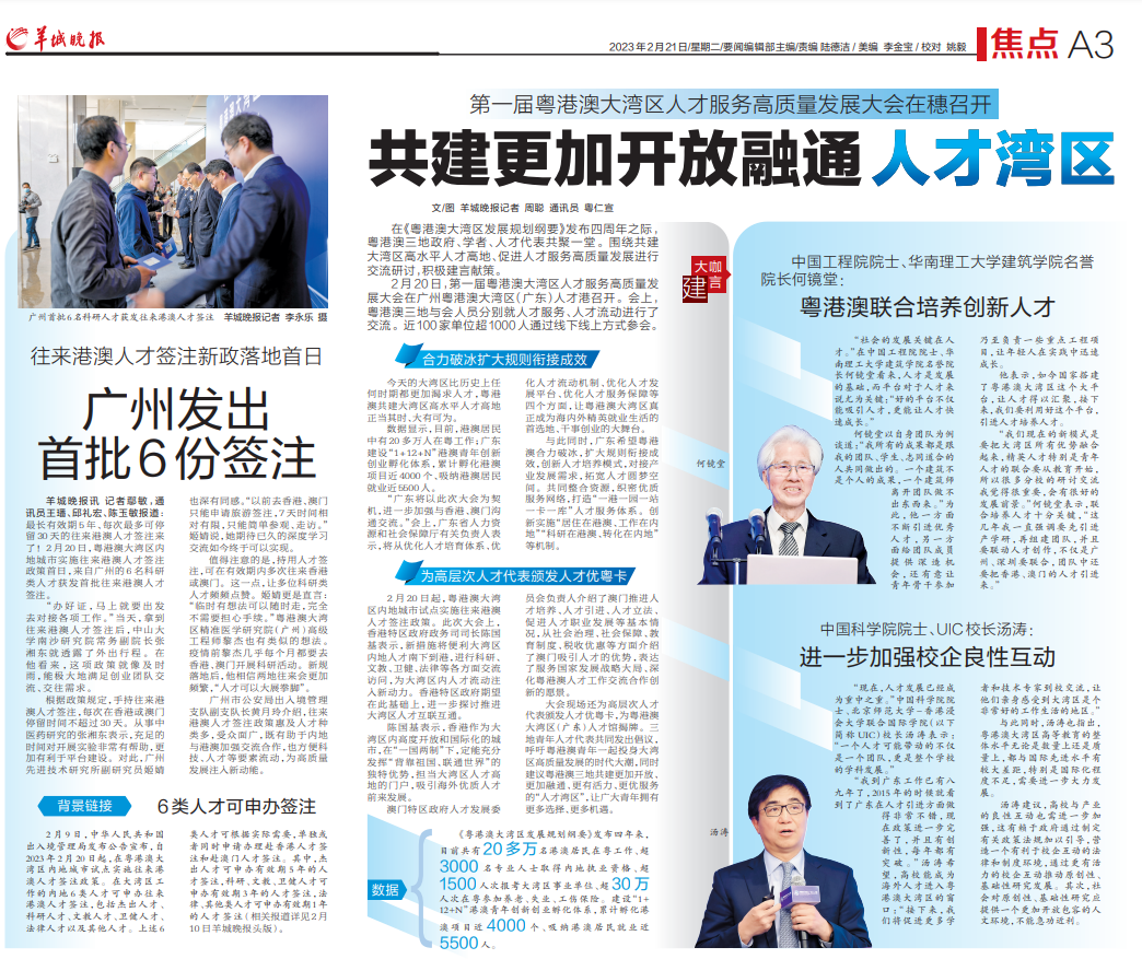 “我到广东工作已有八九年了,2015年的时候就看到了广东在人才引进方面做得非常不错,现在政策进一步完善了,并且有创新性,每年都有突破。”汤涛希望,高校能成为海外人才进入粤港澳大湾区的窗口:“接下来,我们将促进更多学者和技术专家到校交流,让他们亲身感受到大湾区是个非常好的工作生活的地区。”