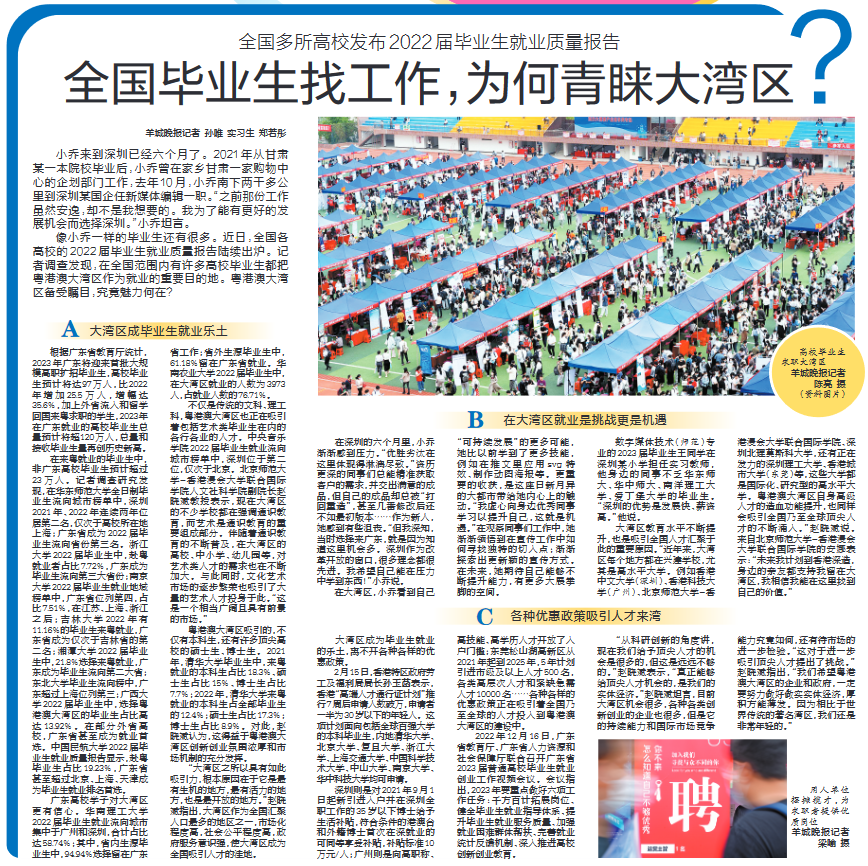 像小乔一样的毕业生还有很多。近日,全国各高校的2022届毕业生就业质量报告陆续出炉。记者调查发现,在全国范围内有许多高校毕业生都把粤港澳大湾区作为就业的重要目的地。粤港澳大湾区备受瞩目,究竟魅力何在?
