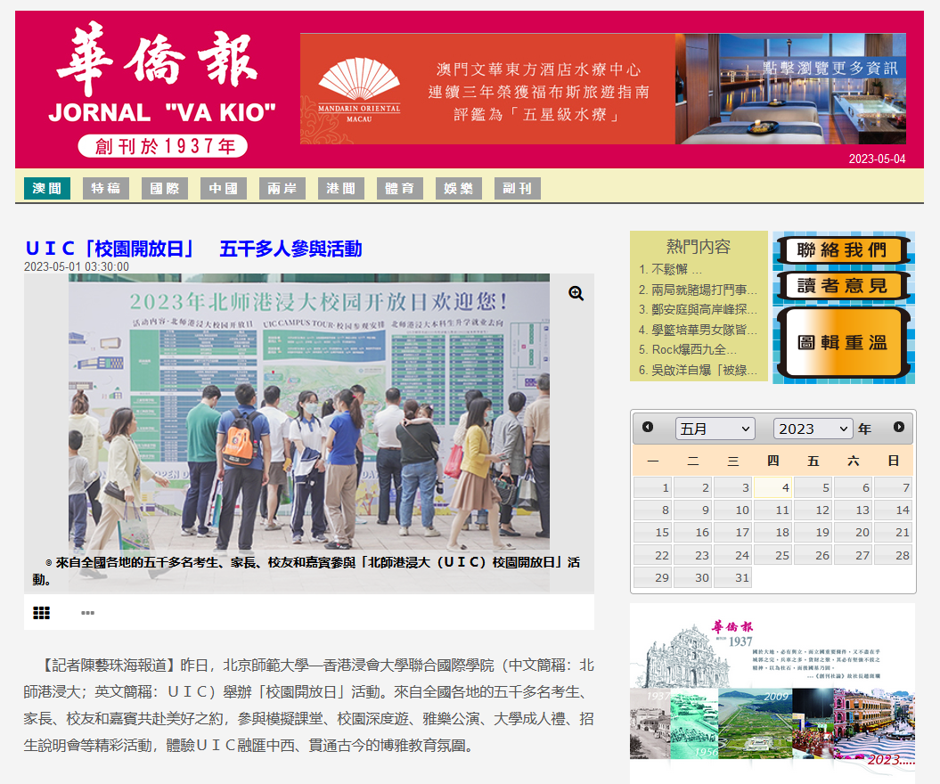 【記者陳藝珠海報道】昨日,北京師範大學—香港浸會大學聯合國際學院(中文簡稱:北師港浸大;英文簡稱:UIC)舉辦「校園開放日」活動。來自全國各地的五千多名考生、家長、校友和嘉賓共赴美好之約,參與模擬課堂、校園深度遊、雅樂公演、大學成人禮、招生說明會等精彩活動,體驗UIC融匯中西、貫通古今的博雅教育氛圍。