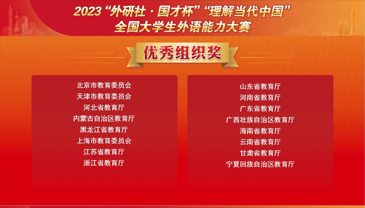 12月8日,2023“外研社·国才杯”“理解当代中国”全国大学生外语能力大赛国赛落幕。比赛以“理解中国,沟通世界”为主题,分为英语组和多语种组两大组别,历经校赛、省赛、国赛三个赛段,来自1300多所院校的近百万学生参赛。大赛由北京外国语大学主办、外语教学与研究出版社承办。