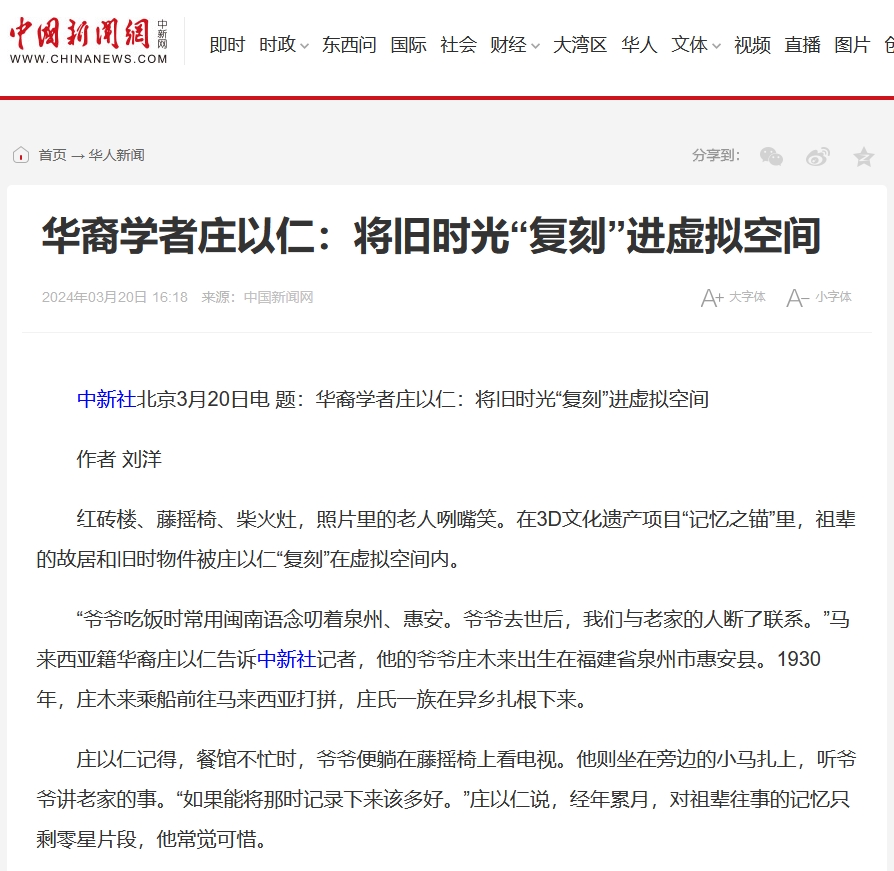 中新社北京3月20日电 题:华裔学者庄以仁:将旧时光“复刻”进虚拟空间