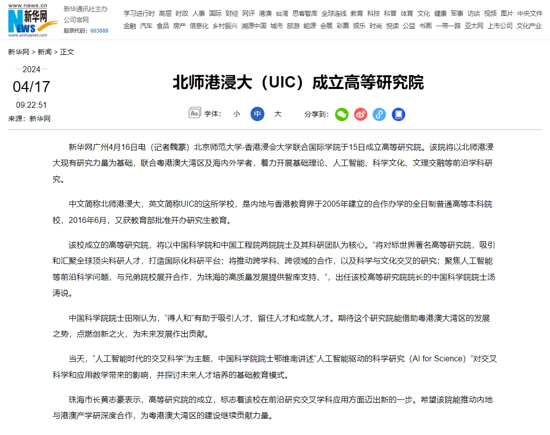 新华网广州4月16日电(记者魏蒙)北京师范大学-香港浸会大学联合国际学院于15日成立高等研究院。该院将以北师港浸大现有研究力量为基础,联合粤港澳大湾区及海内外学者,着力开展基础理论、人工智能、科学文化、文理交融等前沿学科研究。