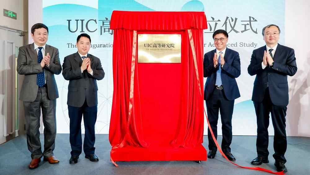 珠海市委副书记、市长黄志豪(左二),珠海市委常委、副市长晁桂明(右一),北师港浸大(UIC)校长陈致(左一),北师港浸大(UIC)高等研究院院长汤涛为高等研究院揭牌 受访者供图