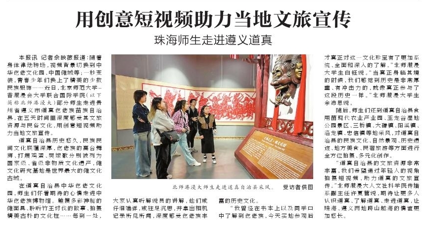 本报讯 记者佘映薇报道:随着身体律动转场,视频背景切换到中华仡佬文化园、中国傩城等;一秒变装,青春少年们换上了精美的少数民族服饰……近日,北京师范大学-香港浸会大学联合国际学院(以下简称北师港浸大)部分师生走进贵州省遵义市道真仡佬族苗族自治县,在五天时间里深度感受其文旅资源与民俗文化,用创意短视频助力当地文旅宣传。