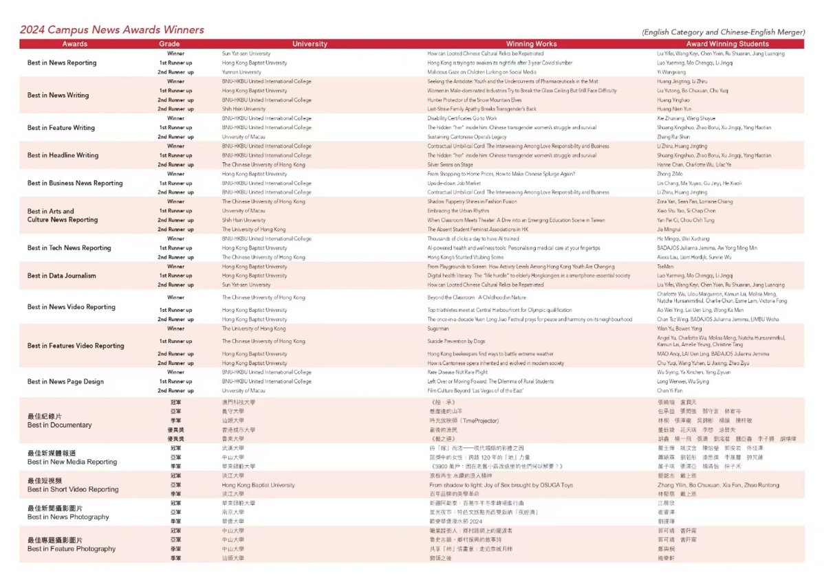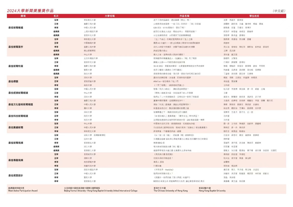今年是大学新闻奖成功举办的第十三年,本届组委会特设最佳纪录片奖项,鼓励学生以镜头捕捉社会现实,立体呈现不同地区的人文历史,吸引了更多海峡两岸暨港澳地区的学校参与,共收到来自90余所院校的近千份优秀作品,参赛人数超过三千人。其中包括香港8所大学,澳门3所大学与台湾11所大学,涵盖香港中文大学、澳门大学、世新大学、北京大学和清华大学等知名高校,其中台湾学校数量较去年增加了30%。此次大学新闻奖共颁发中英文组别奖项及最踊跃参与奖等共28个奖项,共39间学校参赛作品入围,入围学生近300人,香港浸会大学斩获最多奖项。
