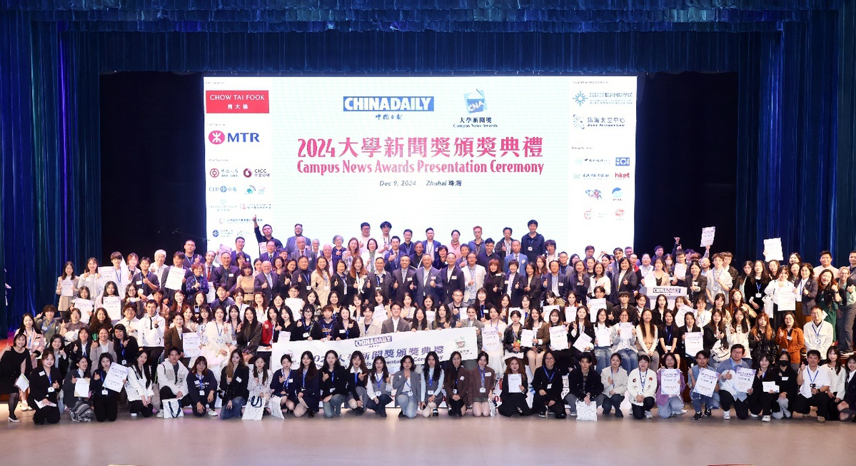 由中国日报主办的2024大学新闻奖颁奖典礼于12月9日在北京师范大学-香港浸会大学联合国际学院(UIC)举行。香港特别行政区政务司副司长卓永兴、北京师范大学-香港浸会大学联合国际学院校长陈致、周大福珠宝集团董事总经理黄绍基现场致辞,中国日报社副总编辑兼香港版总编辑周立致欢迎辞,香港迪士尼乐园传讯及公共事务副总裁黎珮珊在中场发表演讲。今年,大学新闻奖组委会还于颁奖典礼前后组织师生参访团,到周大福顺德匠心智造中心及珠海太空中心参访交流,深入了解大湾区的商业与科技发展文化。