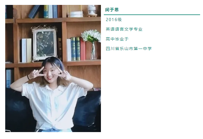 大学四年,闵于思不仅读了许多优秀的文学作品,也有自己独特的收获。“跟着老师们的指引观察时代背景与文本的互动,进一步提升了文本阐释能力。同时,学会了不少做研究的方法和技巧,自学能力也得到提升。”