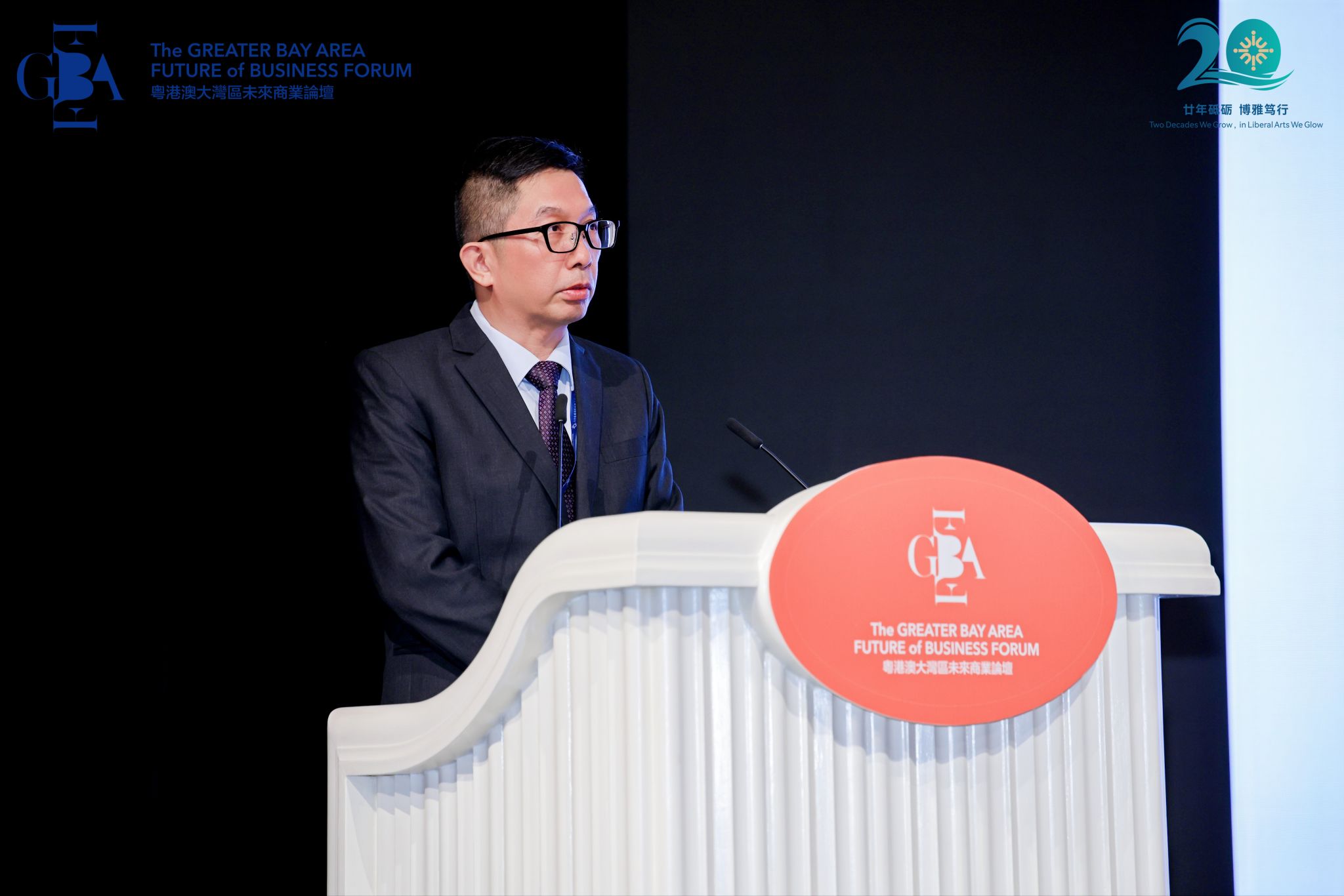 北师港浸大校长陈致、澳门教育及青年发展局副局长黄嘉祺、浸大副校长(教与学)周伟立和香港教育统筹委员会主席黄友嘉出席论坛并依次为开幕式致辞