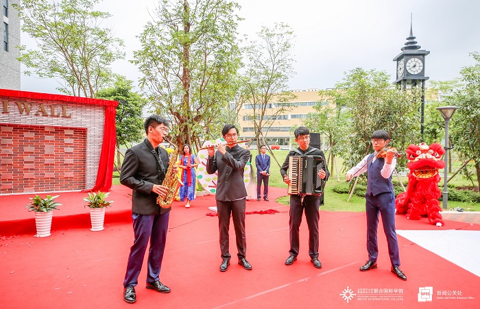 在揭幕仪式之后,现场响起了悠扬的小提琴声,师生或奏响乐器,或放声歌唱,陆续从人群中走出,深情演绎《我和我的祖国》,全场师生及校友一起挥舞手中的国旗进行大合唱,热情激昂的歌声回荡在UIC校园。在这个新老生欢聚,寓意传承的时刻,师生以一场别开生面的音乐快闪献礼即将到来的新中国70华诞。