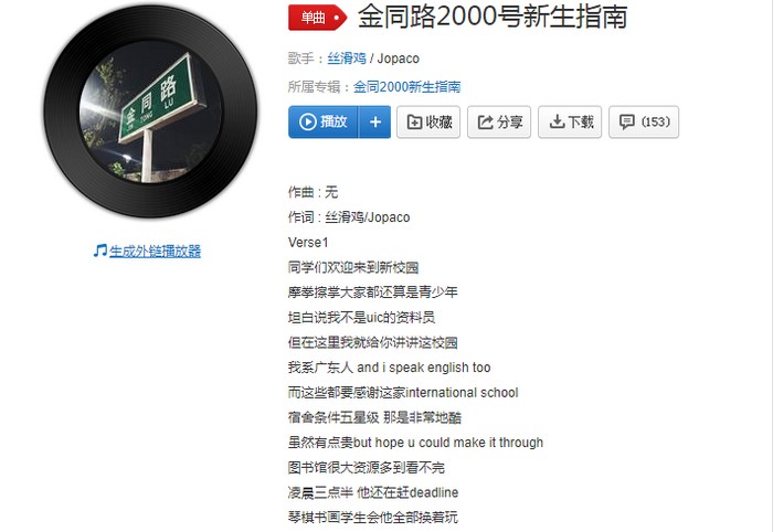 “这首歌是和学校女篮教练携手创作的,我们暑假分别写词,返校后在宿舍录音做了简单处理就发出去了,刷屏朋友圈心里美滋滋的。”陈清越表示,在开学阶段创作这首歌是希望更多的人解UIC,最想表达的就是对新生的欢迎,希望他们在这四年可以开开心心学到东西。这首歌在网易云上发表12小时内播放量就超过4000,收获上百条评论,圈粉无数。
