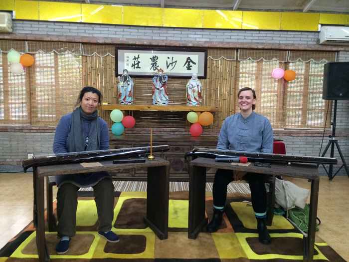 嵇纳(右)与古琴教师李曼(左)在中华文化传播研究院揭幕仪式上共同表演