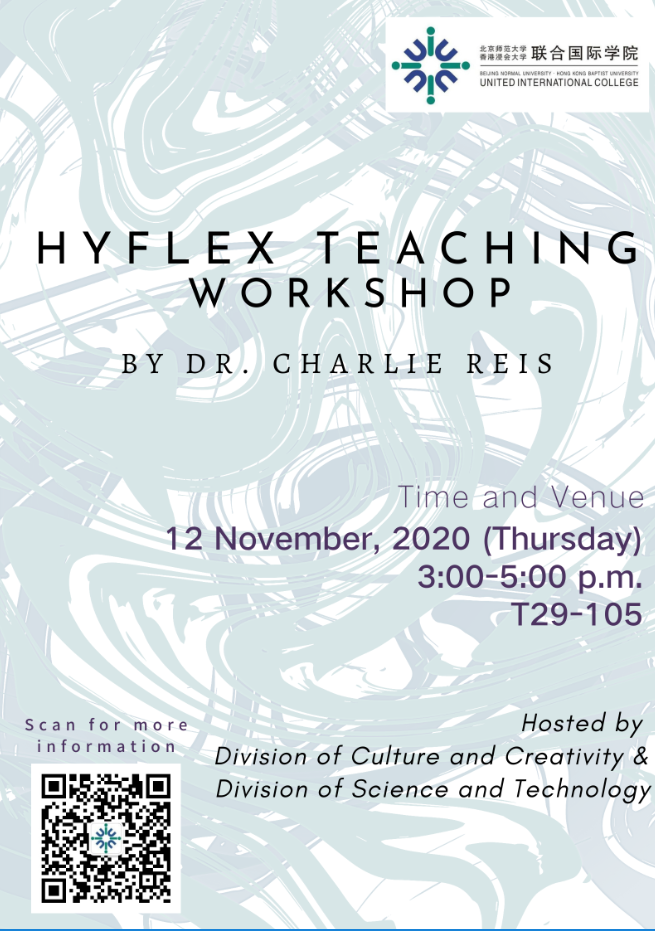 You are cordially invited to attend a workshop on HyFlex Teaching and the improvement of online and offline teaching, presented by Dr. Charlie REIS (XJTLU) on 12 November 2020. The workshop is jointly organized by the Division of Culture and Creativity (DCC) and the Division of Science and Technology (DST). All staff not teaching at that time are extremely welcome to come and join us. The details are as follows: