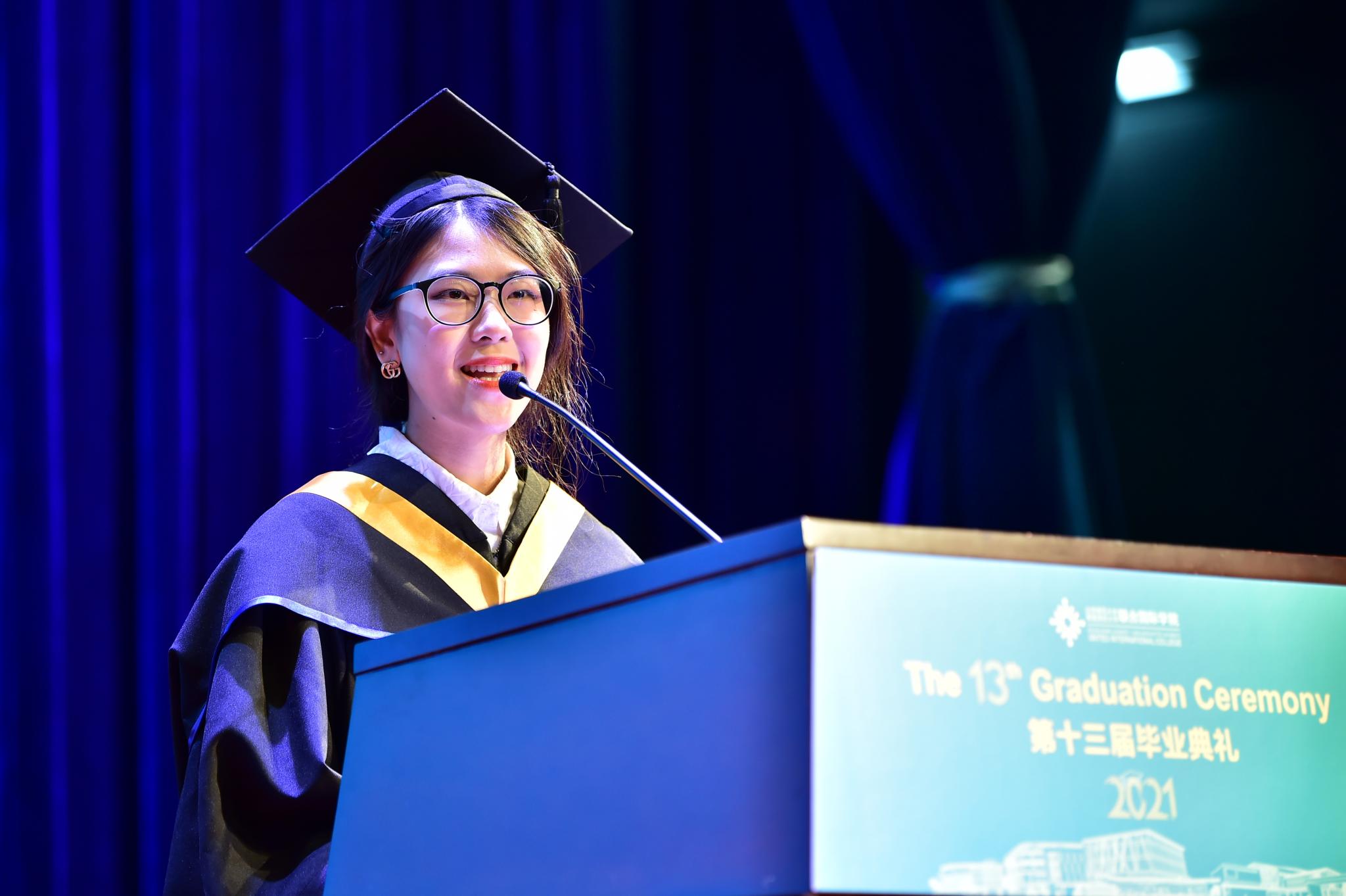 Good afternoon, President Tang, teachers, proud parents and my fellow graduates. Thank you for joining me to celebrate this wonderful moment. I am Chen Yang from food science and technology program. Today is a day of joy, a proud day for my UIC classmates. We are living in an interesting time, a world that is full of challenges, including COVID-19. Still, we have managed to reach this wonderful milestone.